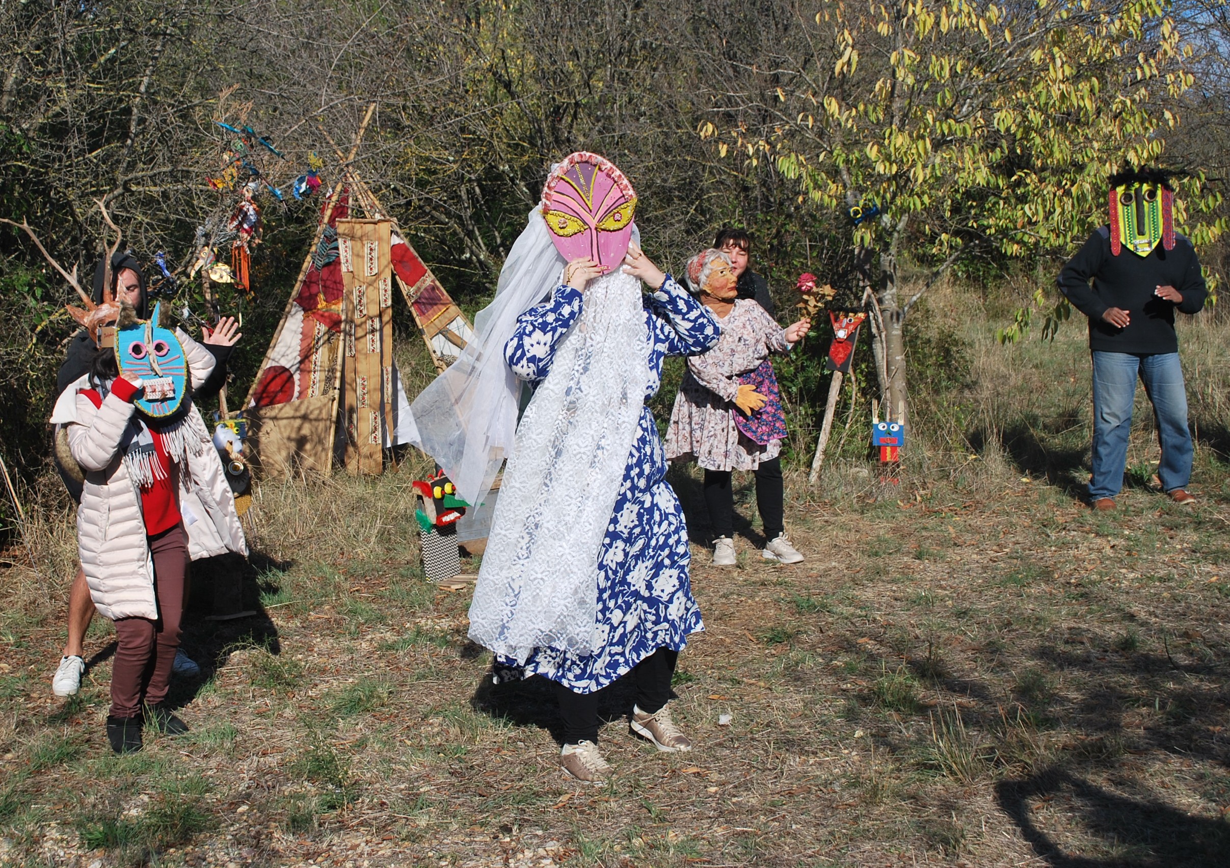 Dans nos derniers projets de création en partage, « Enforestons-nous ! » et « Ensauvageons-nous ! » nous questionnons notre rapport au vivant. Il s’agit de mettre en avant de façon poétique et décalé les liens qui nous entretenons avec lui, sous la forme d’un spectacle en déambulation, où marionnettes à taille humaine, arts plastique (masque, totem, photos), théâtre, danse et interviews s’entremêlent.